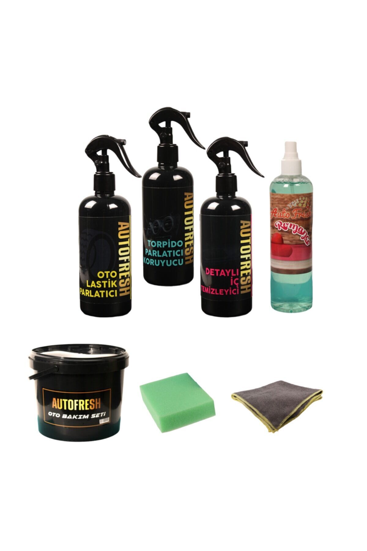 AUTO FRESH OTO BAKIM SETİ TEMİZLİK VE KORUMA SETİ KARŞILACAK 7 ÜRÜNLÜ SET İÇERİK: LASTİK VE TAMPON PARLATICI 425 ML; TORPİDO GÖĞÜSLÜK PARLATICI KORUYUCU 425 ML; DETAYLI İÇ TEMİZLEYİCİ 425 ML; AUTOFRESH OTO KOKUSU 400 ML; UYGULAMA SÜNGERİ 1 ADET; MİKRO FİBER BEZ 1 ADET; PLASTİK KOVA 9 LT : ORGANİZER VE SU KOVASI OLARAK KULLANIM;