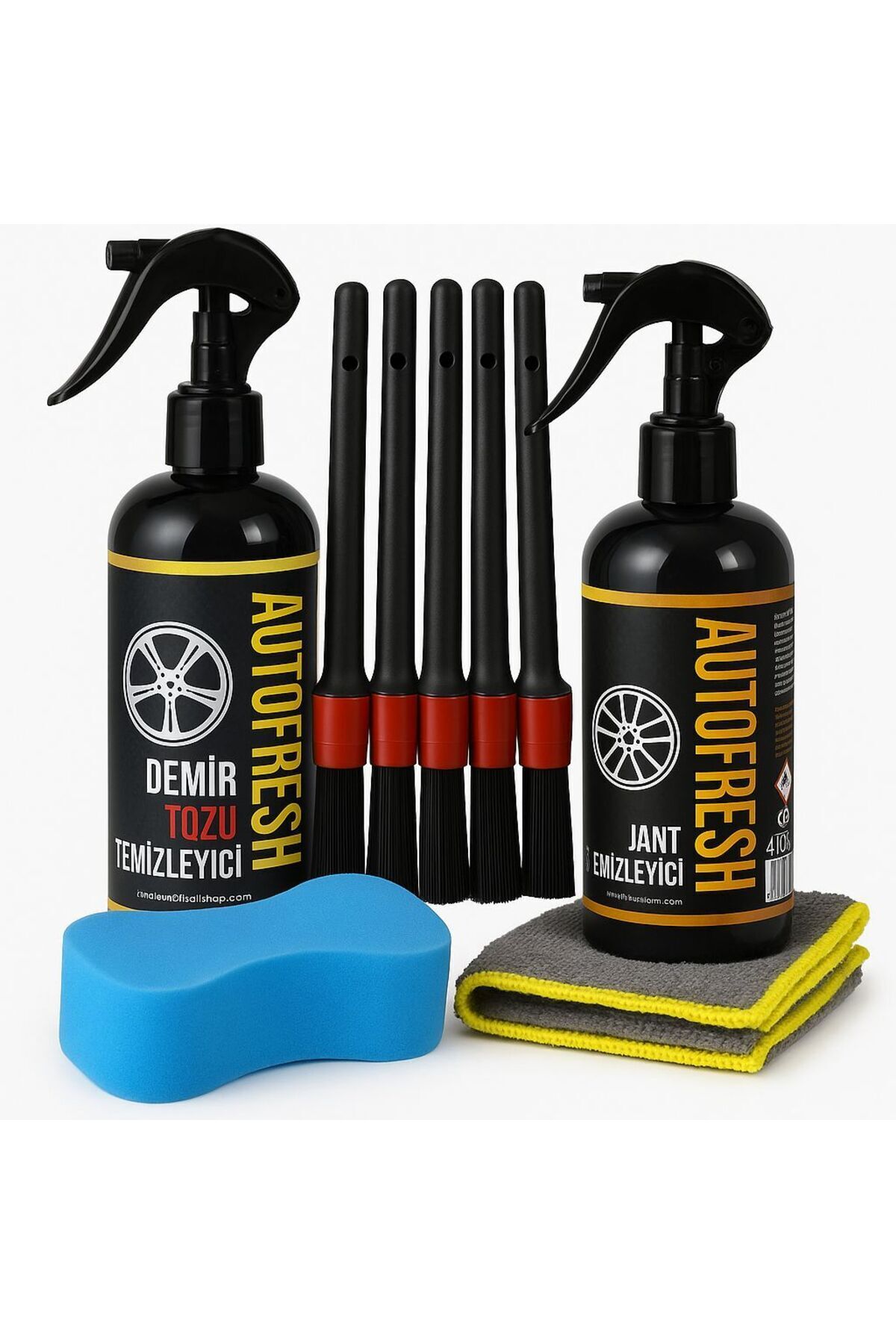 AUTOFRESH Jant Temizleme Seti, aracınızın jantlarını ve yüzeylerini en iyi şekilde temizlemeniz için özel olarak tasarlanmıştır.; Set içerisinde bulunan Demir Tozu Temizleyici ve Jant Temizleyici, jant yüzeyinde oluşan inatçı demir tozu, fren balata kalıntısı ve kirleri güçlü formülü sayesinde kolayca söker.; 5 farklı boydaki detay fırçası, jant aralarına, dar bölgelere ve detaylı temizlik gereken yerlere ulaşmanızı sağlar.; Mikrofiber bez, çizmeden ve iz bırakmadan kurulama yapar.; Dayanıklı sünger ise köpükleme ve yüzey temizliğinde pratik bir kullanım sunar.; Bu set sayesinde aracınızın jantları ilk günkü parlaklığına kavuşur.;