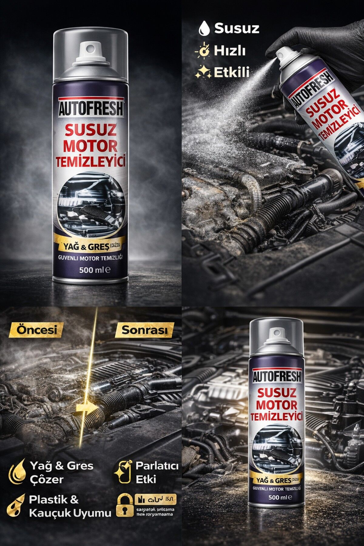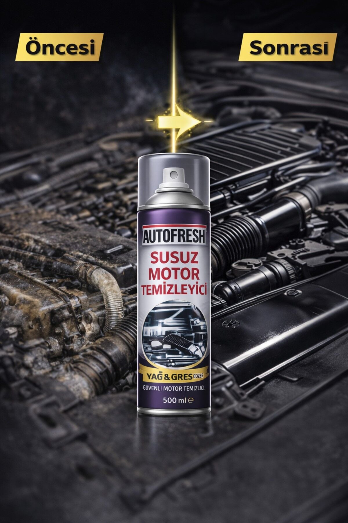 AUTOFRESH Susuz Motor Temizleyici, motor bölmesinde biriken yağ, gres ve inatçı kirleri suya ihtiyaç duymadan etkili şekilde temizlemek için geliştirilmiştir. Özel formülü sayesinde motor aksamına zarar vermeden derinlemesine temizlik sağlar.